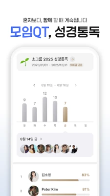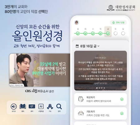 국내 크리스천 10명 중 6명이 선택한 성경앱의 특별함을 경험하세요. 강력한 성경 학습 도구, 매일의 묵상, 그리고 활기찬 신앙 공동체와 함께 풍요로운 영적 여정을 시작하세요. 깊이 있는 말씀 생활을 더욱 쉽고 편리하게 누릴 수 있습니다.
