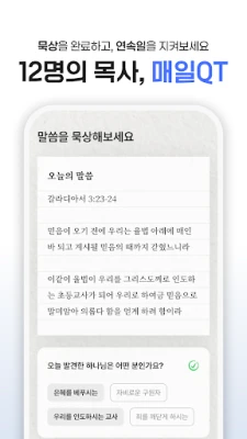 매일의 영적 성장을 위한 큐티와 기도는 초원 성경에서 특별한 경험이 됩니다. 12인의 국내 목회자들이 매일 집필하는 큐티 묵상으로 깊이 있는 통찰을 얻고, 오늘의 말씀, 묵상, 기도문을 자동으로 기록하여 신앙의 발자취를 남길 수 있습니다. 특히, 첨단 성경AI 기능은 예수님과의 첫 만남부터 구약 율법의 현대적 적용까지, 어떤 신앙 질문에도 말씀에 근거한 명쾌한 해답을 제시합니다. 모든 장과 절에 대한 신학적 해설과 AI 묵상, AI 기도문 추천까지, 오직 초원 성경에서만 만날 수 있는 혁신적인 기능으로 말씀의 깊이를 더해보세요.