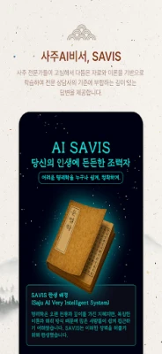 여기서 그치지 않습니다. '만세력 설명서'는 최신 기술을 접목하여 당신의 삶에 더 깊은 통찰을 선사합니다. 새롭게 도입된 **AI 사주 상담 서비스 'SAVIS'**를 통해 개인의 성향, 연애운, 재물운, 직업운 등 인생의 중요한 영역에 대한 맞춤형 조언을 실시간으로 받아볼 수 있습니다. 단순한 정보 나열을 넘어, 인공지능이 당신만을 위한 섬세한 분석과 실질적인 가이드를 제공하여, 막연했던 미래의 단서를 찾아드립니다.