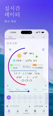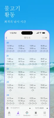 매일의 조석 차트와 계수, 고조 및 저조 시각부터 파도의 높이, 주기, 방향까지 상세하게 파악할 수 있습니다. 육상 및 해상 풍속, 돌풍, 풍력 정보는 물론, 시간별 바람표와 서핑표로 활동 계획을 완벽하게 세울 수 있습니다. 낚시를 즐기는 분들을 위해 매일 최고의 낚시 순간과 주요/부차적인 솔루나 기간을 포함한 월간 활동표를 제공하여, 풍성한 조과를 기대할 수 있도록 지원합니다.